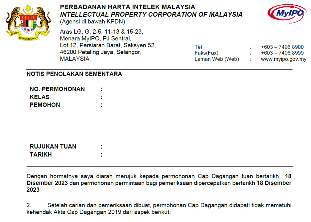 - Tidak memenuhi kriteria pendaftaran dalam Akta Cap Dagangan 2019.