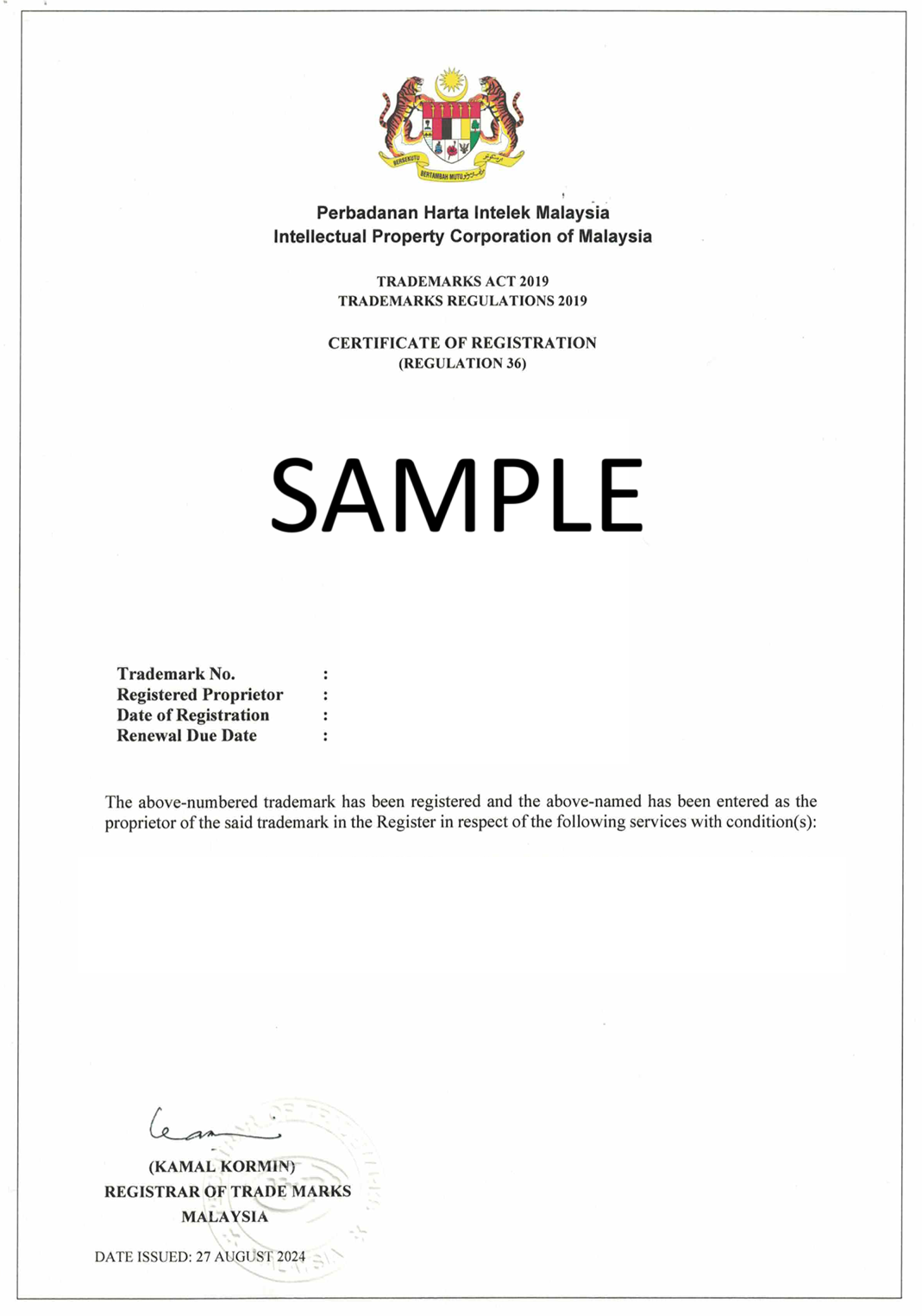 SAMPLE OF TRADEMARK DOCUMENT PROOF OF FILING DOCUMENT: NOTIFICATION OF REGISTRATION: CERTIFICATE OF REGISTRATION: